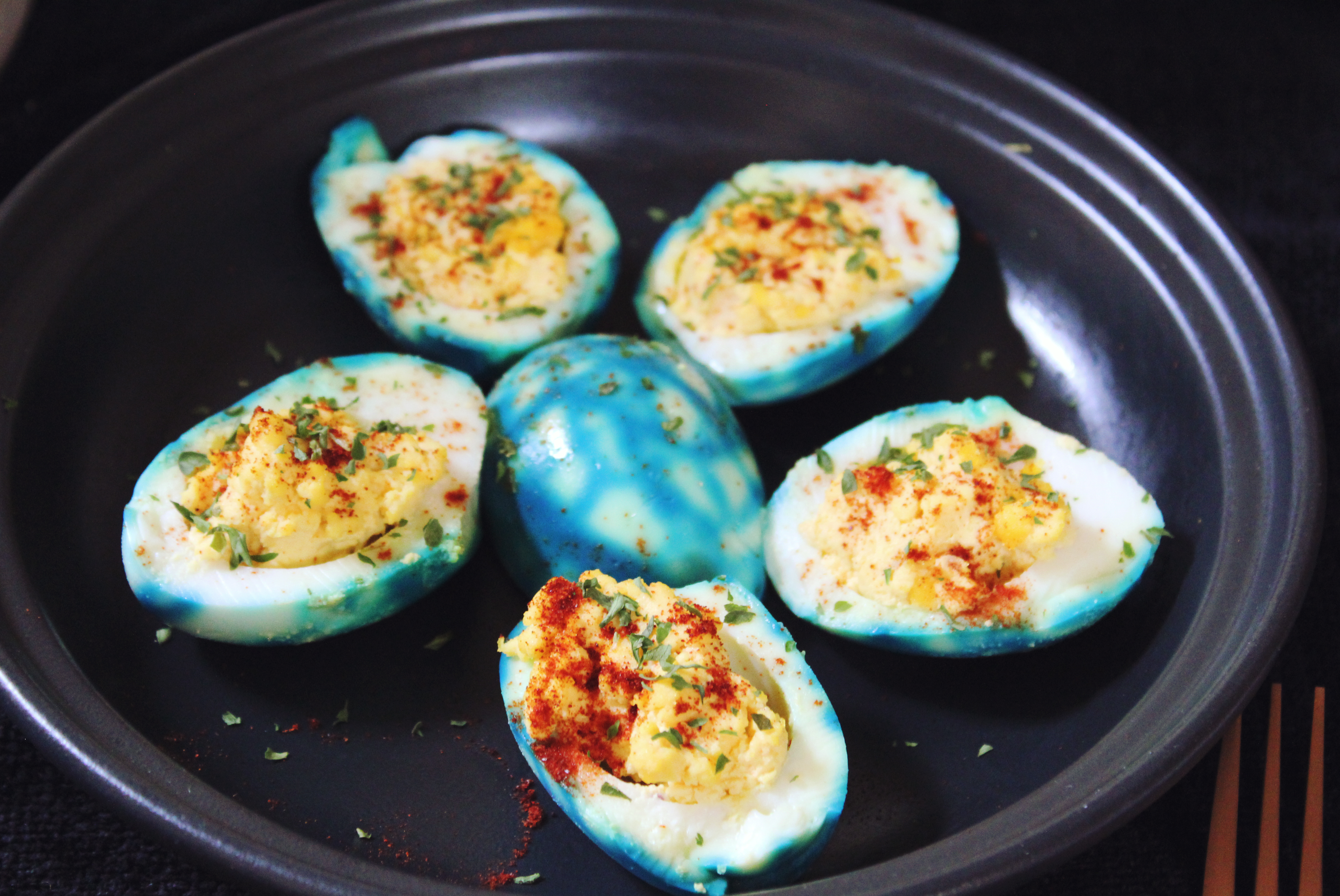 These look like they took a lot of effort to make, but they really didn’t! You start of by boiling the eggs. Once their hard boiled, cool them down and then crack the shell layer but don’t peel them. In a zip-loc, put a couple of drops of food coloring (I mixed blue and green). Put the cracked egg in the zip-loc and roll it around in the bag so it gets an almost even coat of the food coloring. Repeat for all eggs, leave in the bag, then put them in the fridge for at least 30 minutes. After 30 minutes, take them out of the fridge, peel like normal, and it’ll have this cracked pattern! Cut each egg in half and scoop out the yokes. Mash the yokes together with some mayonnaise and mustard, then put the mixture back into each egg and sprinkle with paprika and (optional) dried parsley.