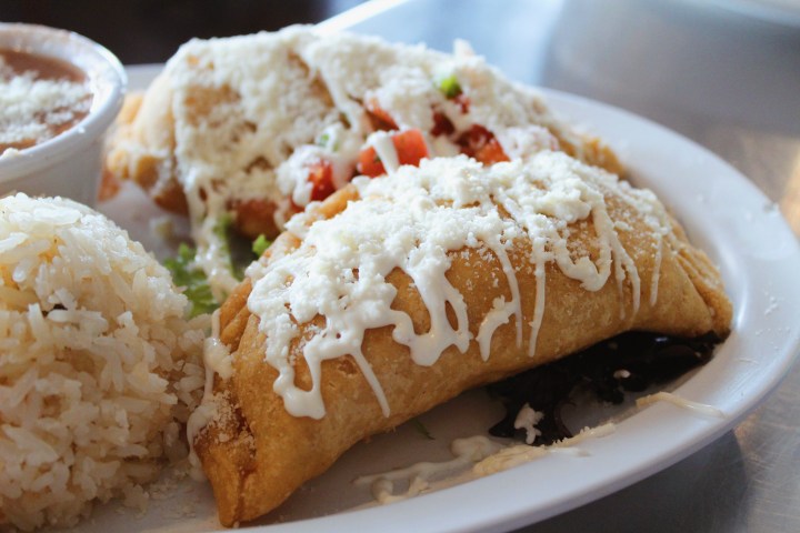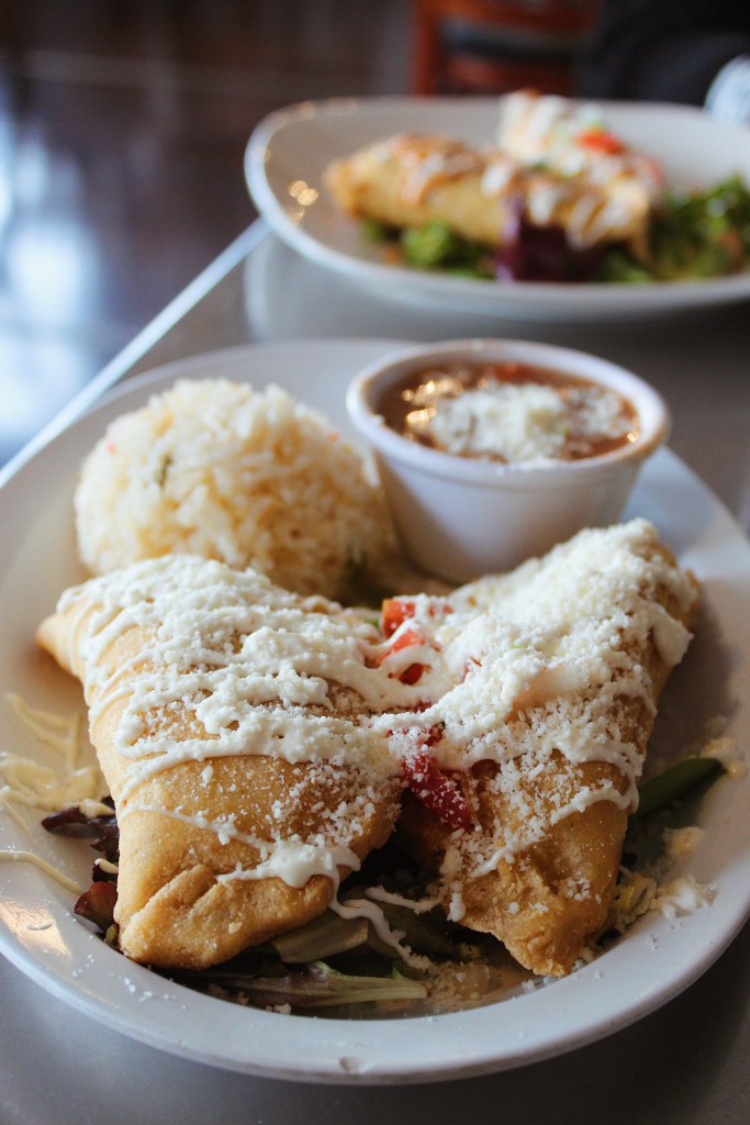 Next up, we got the Empanada entree. The empanadas are made of fresh, handmade corn masa (dough) and filled with poblano chicken and Oaxaca/jack melted cheese, then fried until crispy then topped with lettuce, pico de gallo, sour cream and cotija cheese. Served with rice and beans. You can also order them with carnitas. Again, fried dough is always a win, and you get a nice thick layer with empanadas. I really want to call out the rice! It was so soft and flavorful.