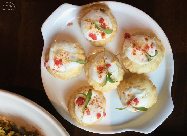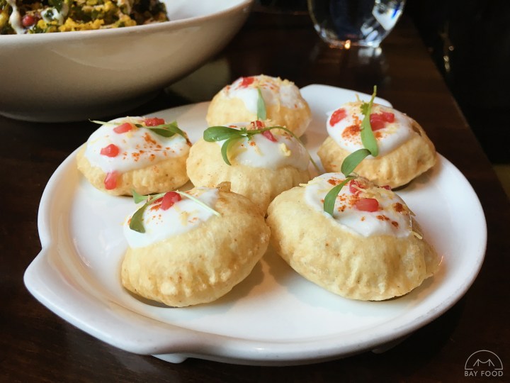 This is Rooh’s Dahi Puri, with avocado, tamarind, mint & cilantro chutney, with yogurt mousse and pomegranate seeds on top. It really captures the essence of pani puri with the traditional puff shape and all of the different flavor elements, while giving it a modern twist with the yogurt mousse and presentation. Traditionally, the puffs are hollow inside and designed to be filled with the chaat filling (a combination of potatoes, chutneys, and yogurt). With Rooh’s version, they’ve brought the filling to the top while you bite into these crispy, flakey puffs. I really enjoyed these too and could’ve eaten the whole plate myself! It has the perfect savory, tangy, and spicy combination you expect out of chaat.