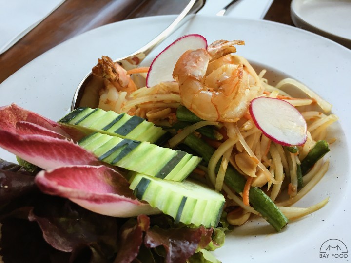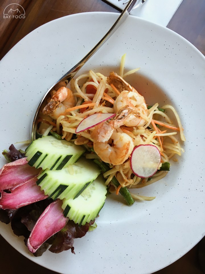 Pictured above is the Som Tum Going Salad, which is a shredded green papaya salad with tiger prawns, carrots, cherry tomatoes, crushed peanuts and served with spicy lime dressing. I think lime dressing is such a fun burst of freshness on salads, so I was immediately into this dish. There were a bunch of great elements here that paired well in each bite. There were fresh, crunchy elements from the vegetables, the kick from the dressing, and perfectly cooked prawns.