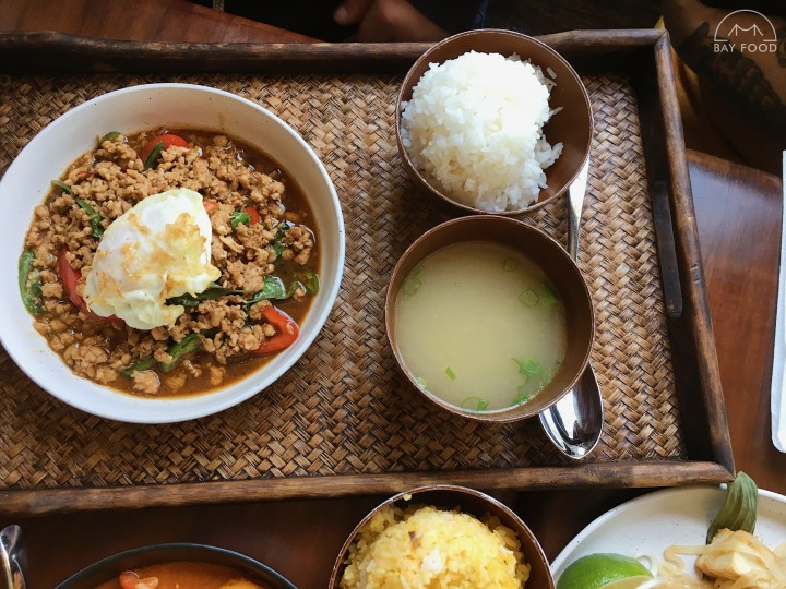 This was the one meat dish we ordered, the Spicy basil chicken. It has stir-fried Thai basil, fresh Mexican chili, bell peppers, onion, garlic, and your choice of meat (it can be served with beef). This dish is served with rice, bone broth, and a fried egg on top. I avoided the egg in case it had a runny yolk, but the dish was great! Because it had ground meat, it felt like the middle ground of a larb dish and a basil chicken dish with chicken pieces.